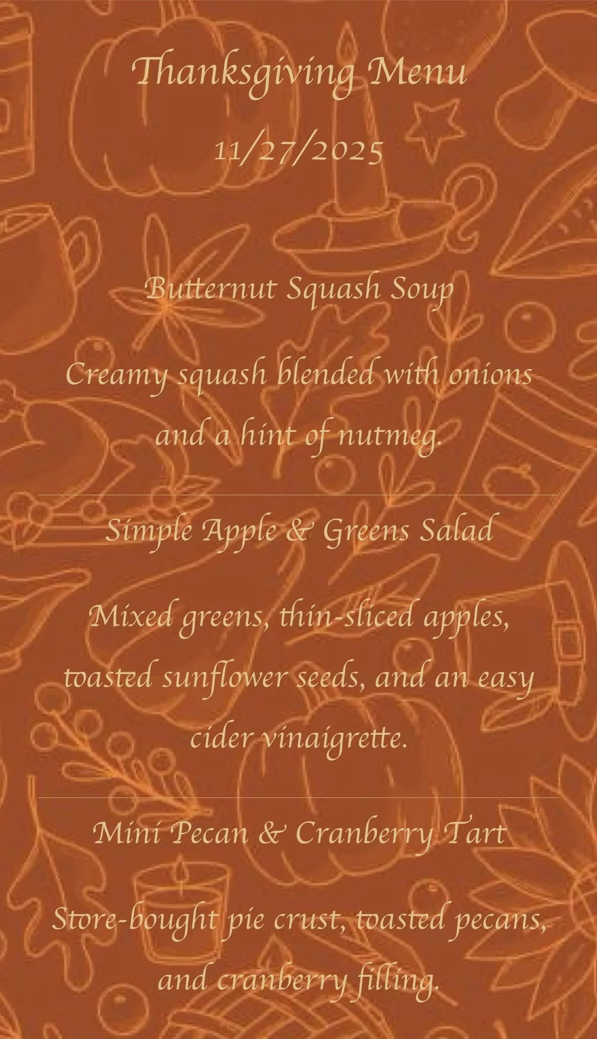 This menu features a variety of autumn flavors, combining comforting favorites with fresh, seasonal ingredients. I aimed to create dishes that feel a bit fancy and special, yet remain affordable and accessible. The result is the selection you see below, designed to bring warmth and delight without stretching the budget.